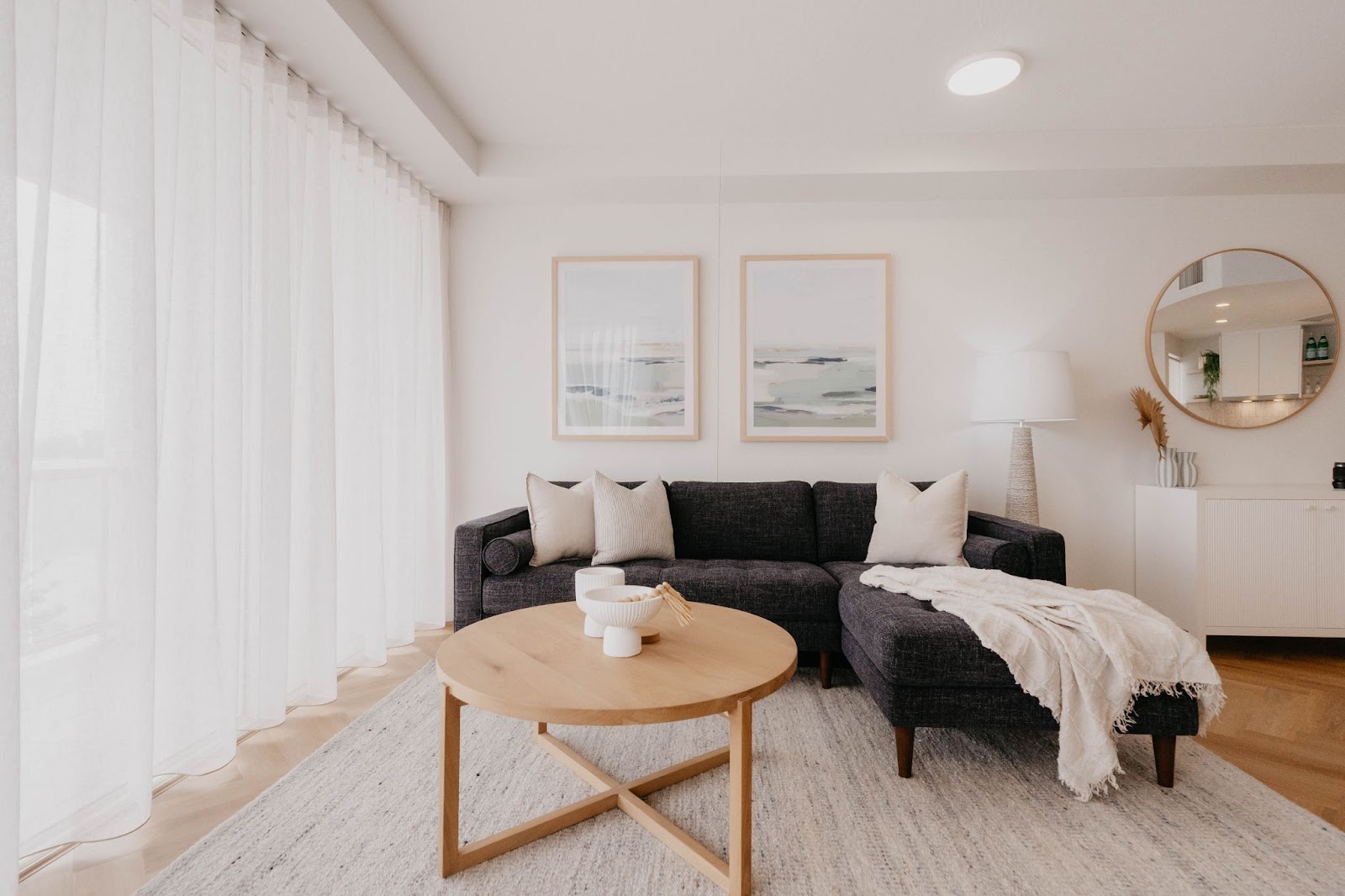 - Daytime: sheers soften glare and protect furniture from UV