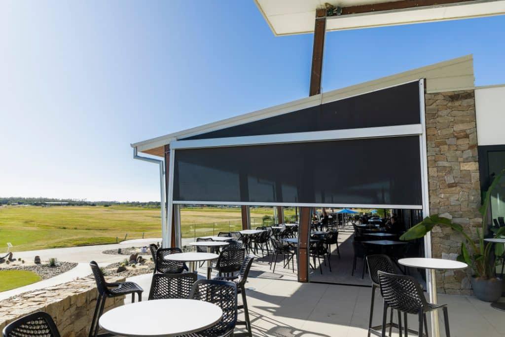 Modern café with glass walls and a large black outdoor retractable blind, providing sun protection and wind resistance.